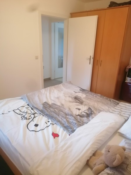 Vollmöblierte Kleinwohnung mit Einbauküche und Geschirrspüler, ausziehbares Sofa, Doppelbett, Waschmaschine, Kleiderschrank, Garderobe, Esstisch mit Stühlen.