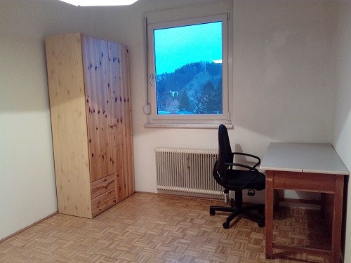 Bett, Kasten und Schreibtisch sind vorhanden, Küche mit Geschirrspüler, Gemeinschaftsraum 18m², Bad mit Dusche. WC getrennt, Kellerabteil.