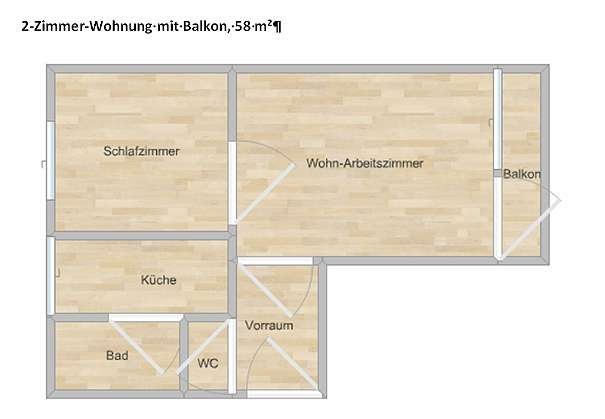 Aufteilung: großes Wohn- und Arbeitszimmer (teilmöbliert) mit Balkon, Schlafzimmer (leer), Küche, Bad und WC getrennt, Vorraum, Abstellraum und Kellerabteil.