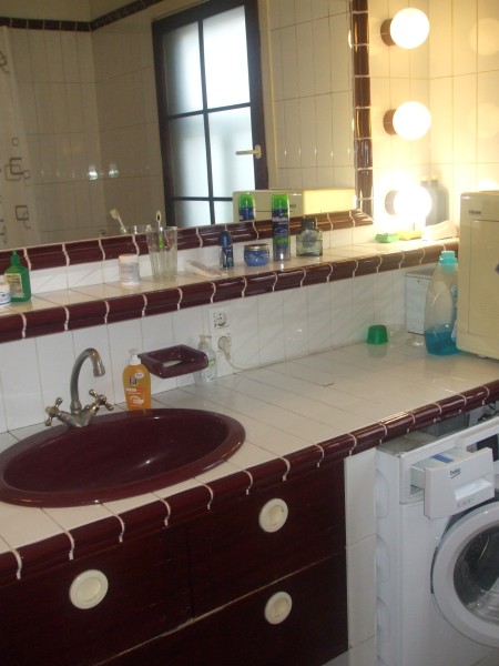Das Badezimmer ist groß, mit Badewanne, Waschmaschine, kleinem Wäschetrockner, großem Wandspiegel.