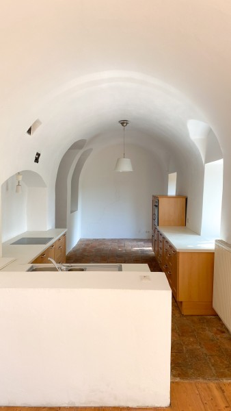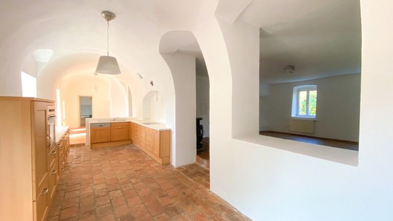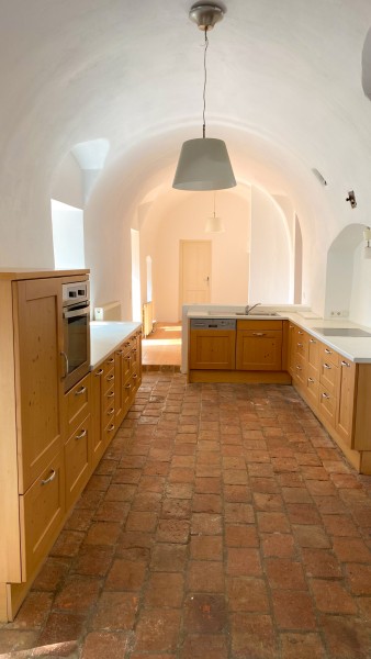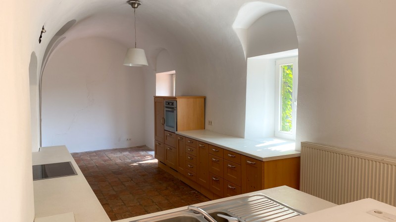 1 offene Küche in hohem Gewölbe mit Blick in den Garten