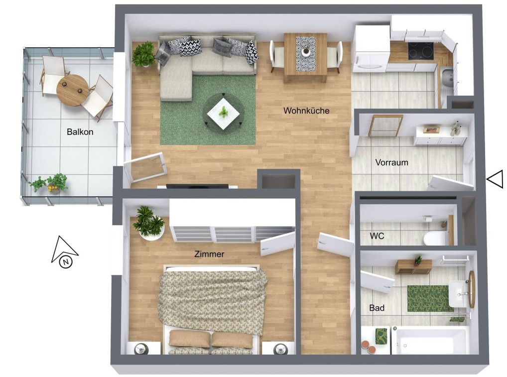 Sie besteht aus 2 Zimmern bei einer Wohnfläche von 54 m² und verfügt über einen 7 m² großen Balkon.
