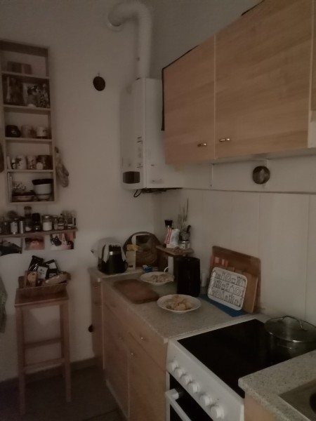Küche voll eingerichtet und zum Sitzen geeignet.