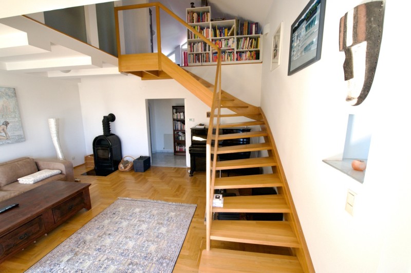 Eine solide Eichentreppe führt in den geräumigen Galeriebereich, halboffen zum Wohnbereich. Ein separater Arbeitsraum bietet Ruhe und Privatsphäre für jene, die auch zu Hause produktiv sein möchten.
