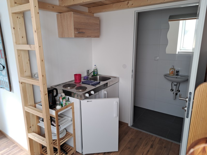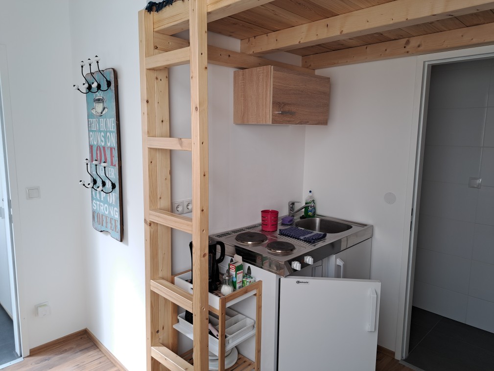 Das kompakte Studio verfügt über eine ausgestattete Küche (Herd, Kühlschrank,Wasserkocher), Duschbad und Wohnraum.