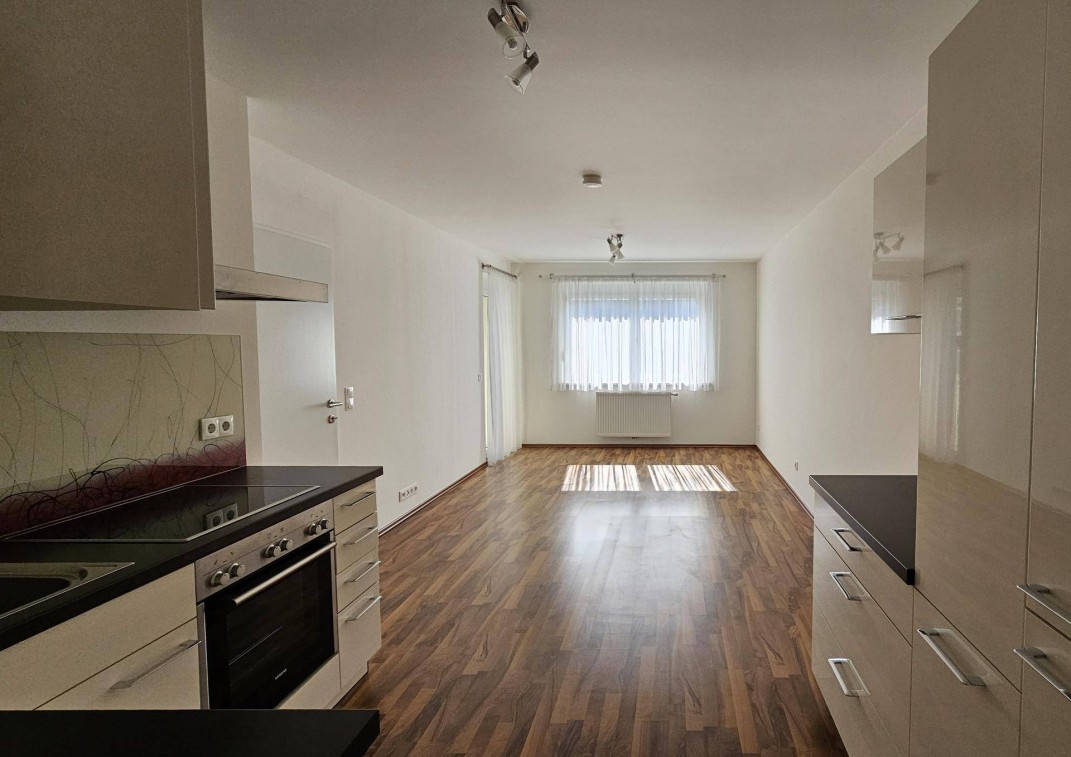 Die helle nach Südwesten ausgerichtete, teilmöblierte 2-Zimmer-Wohnung ist über einen Lift erreichbar. Im Vorraum sorgt ein geräumiger Einbauschrank mit Garderobe für viel Staufläche.