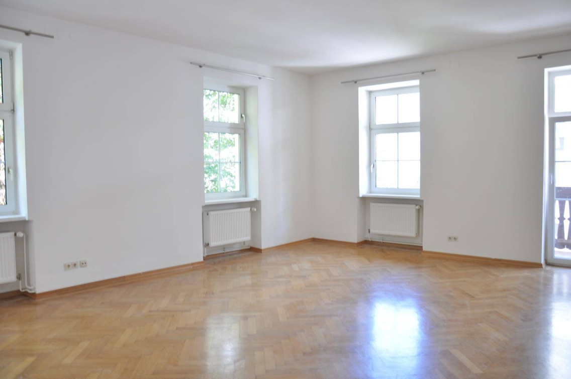 Das Wohnzimmer ist überaus großzügig gehalten (ca. 35m²) und bietet neben viel Platz für einen großen Esstisch und eine Couch auch Zugang zum neu errichteten Balkon (überdacht).