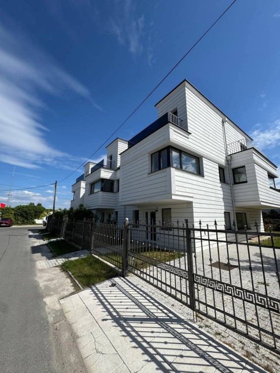 Zur Auswahl stehen drei moderne Reihenhäuser mit identischer, klarer Architektur und hochwertiger weißer Fassadenverkleidung. Jedes Haus erstreckt sich über drei Etagen, verfügt über einen eigenen Balkon sowie eine stilvolle, bereits eingebaute Küche. Die großzügigen Fensterfronten sorgen für helle Wohnräume und unterstreichen das zeitgemäße Designkonzept.Der gepflegte, umzäunte Vorgarten mit gepflastertem Zugang schafft eine angenehme Privatsphäre. Alle Häuser befinden sich an einer ruhigen Anliegerstraße und bieten ein familienfreundliches Umfeld. Ein modernes schwarzes Metallzaunsystem rundet das harmonische Gesamtbild stilvoll ab. Ideal für Familien oder Stadtmenschen mit Anspruch auf modernes Wohnen.