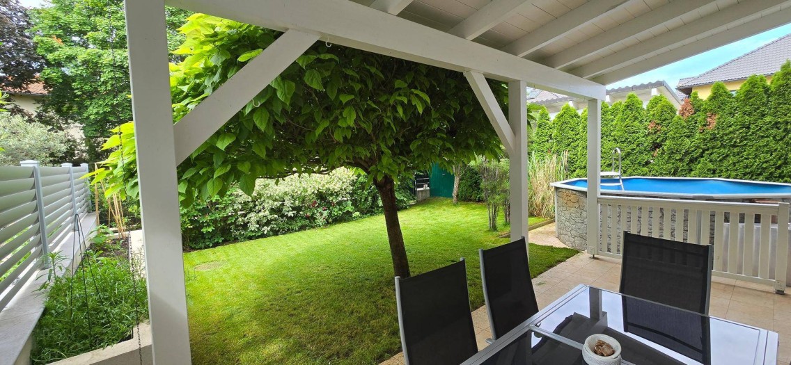 Die einstöckige Immobilie in Massivbauweise besticht durch eine überdachte Terrasse mit 18 m² Fläche und einen 120 m² charmant begrünten Garten mit Hochbeet und Pool. Zur Ausstattung gehören eine Einbauküche, Parkettböden, Klimaanlage und ein Wohn-Keller. Die Beheizung erfolgt über eine Pelletheizung mit Etagenheizung. Für Fahrzeuge steht ein Carport mit zwei Stellplätze zur Verfügung.