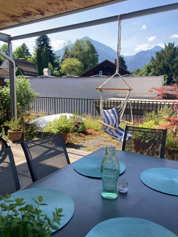 Wohnzimmer und Küche sind direkt miteinander verbunden, besonders schön ist die offene, große überdachte Terrasse nach Süden. Von der Terasse genießt man einen phänomenalen Ausblick Richtung Süden (Karren). Der Schwedenofen im Wohnzimmer trägt zur gemütlichen Stimmung im Winter bei! Durch die weiteren Fenster auf der Westseite ist der zentrale Raum von zwei Seiten hell und freundlich.