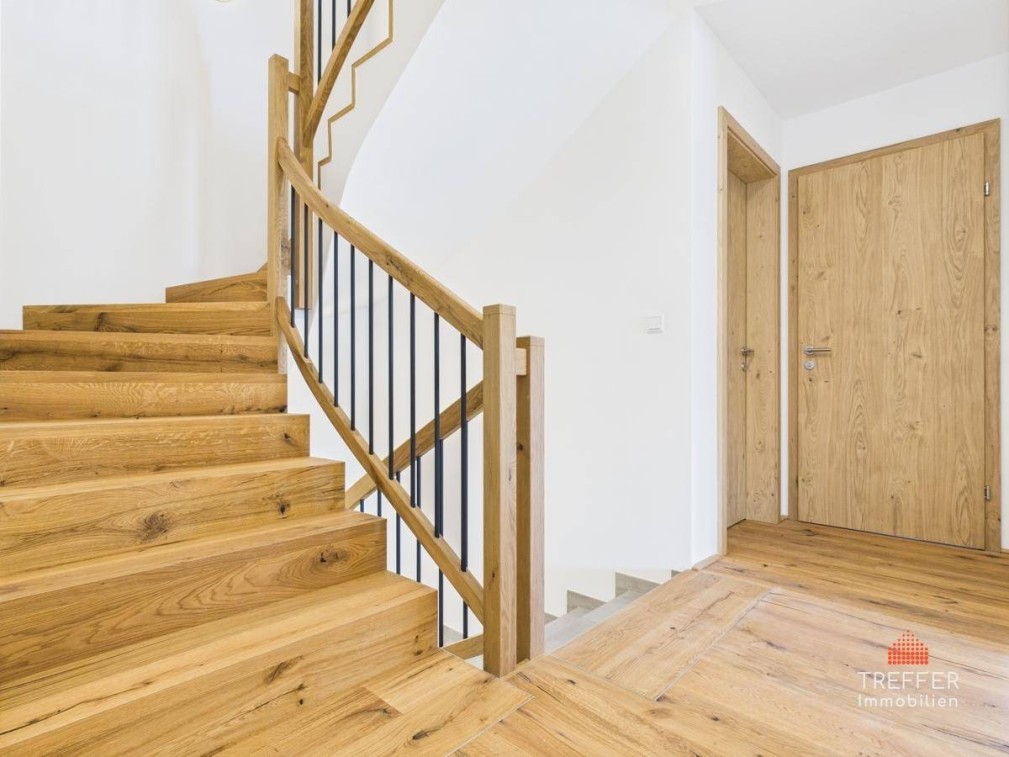 Im Erdgeschoss erwartet Sie ein großzügiger Wohn- und Essbereich mit offener Küche, der durch große Fensterflächen viel Tageslicht erhält und direkten Zugang zur sonnigen Terrasse bietet. Ein praktischer Abstellraum, ein separates Zimmer – ideal als Büro oder Gästezimmer –, ein Gäste-WC sowie ein einladender Vorraum mit Platz für eine Garderobe vervollständigen das Raumangebot auf dieser Ebene.