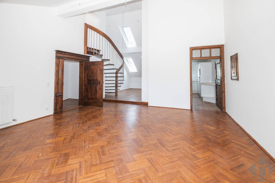 Über eine elegante, freischwebende Holztreppe gelangen Sie ins Obergeschoss der Wohnung. Dort erwartet Sie ein offener Raum, ideal nutzbar als Bibliothek oder Arbeitsbereich, sowie ein ruhig gelegenes Schlafzimmer mit angrenzendem Schrankraum. Das Badezimmer überzeugt mit hochwertiger Ausstattung: Dusche, Badewanne, Waschtisch und WC lassen keine Wünsche offen. Ein zusätzlicher Abstellraum rundet das Angebot im zweiten Dachgeschoss ab.