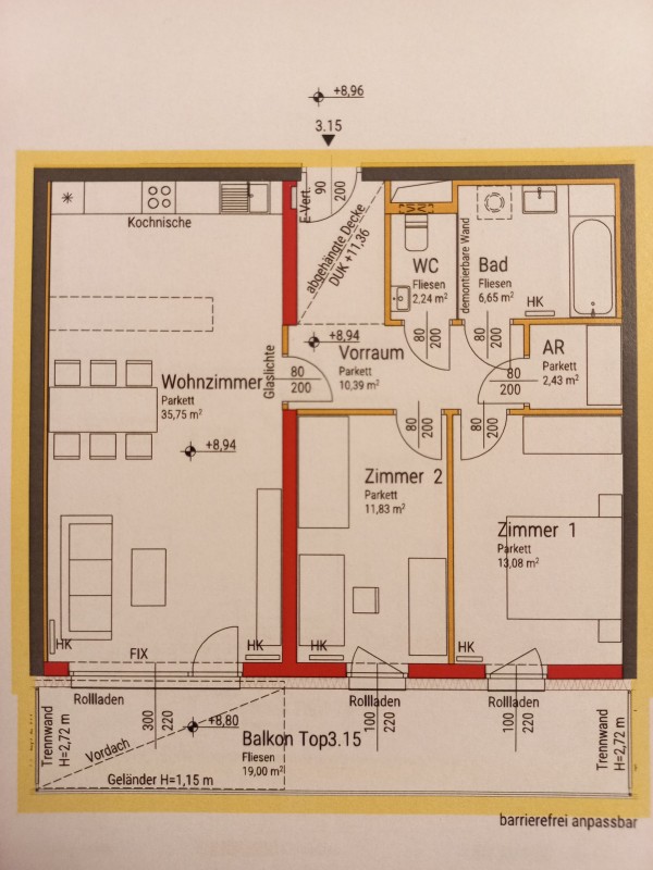 Die Wohnfläche beträgt 82,37m² und 19 m² der Balkon. Die gesamte