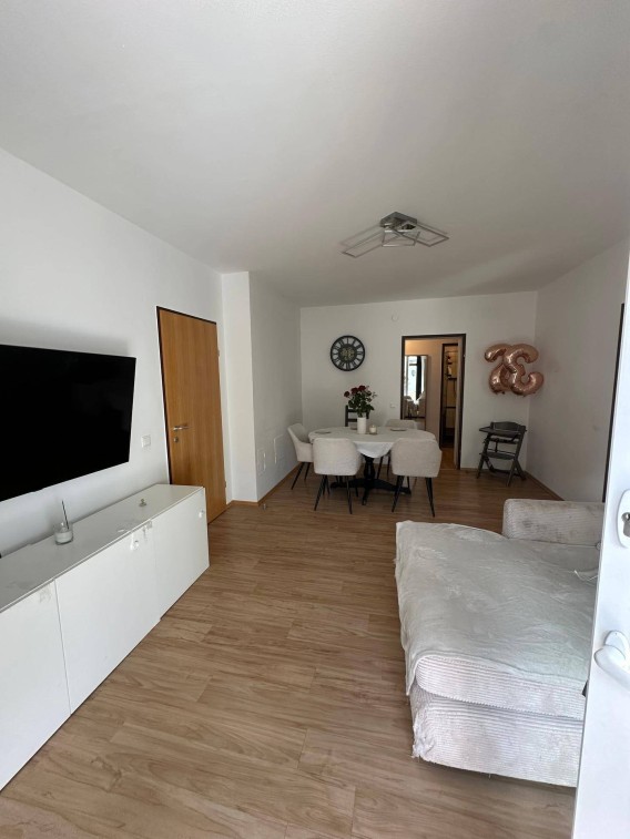 Die Wohnung befindet sich im Erdegeschoß. Die Parkplätze sind direkt vor dem Balkon welcher hauptsächlich als Eingang genutzt wird!
