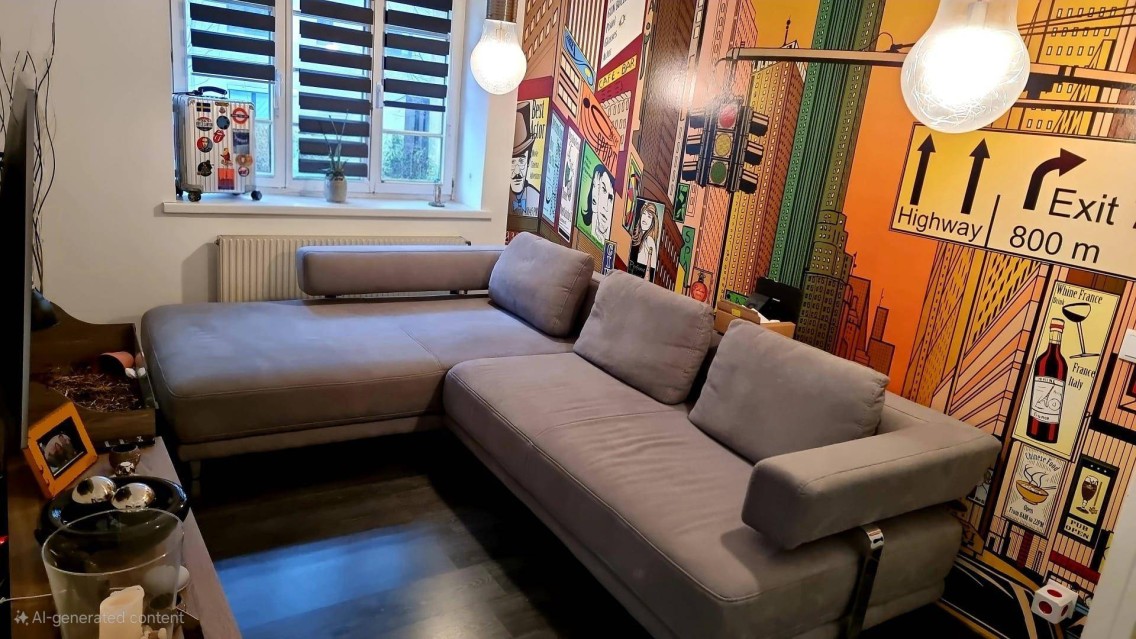 • Wohnzimmer: Ein gemütliches Sofa und ein modernes Lowboard-TV-Element warten auf Sie (Fernseher NICHT inkludiert). Perfekt für entspannte Abende.