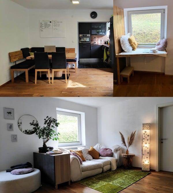 Highlights der Wohnung sind ein nagelneues Schlafzimmer mit deckenhohem Schiebetürenschrank und einem 1,80m Wasserbett für perfekten Schlaf und beheizten Matratzen für die kalten Winternächte in den Bergen. Neben der modernen Küche mit Induktionsfeld & Dampfgarer wurde ein kleiner „Indoorbalkon“ vom Tischler reingezimmert was für zahlreiche Sonnenstunden sorgt. Ein weiteres Highlight ist die großzügige Eckbadewanne. Auch mit Waschmaschine & Trockner verfügbar. Gemeinschaftsgarten mit über 100qm kann mitbenützt werden und läd gerade im Sommer zum verweilen und picknicken ein.