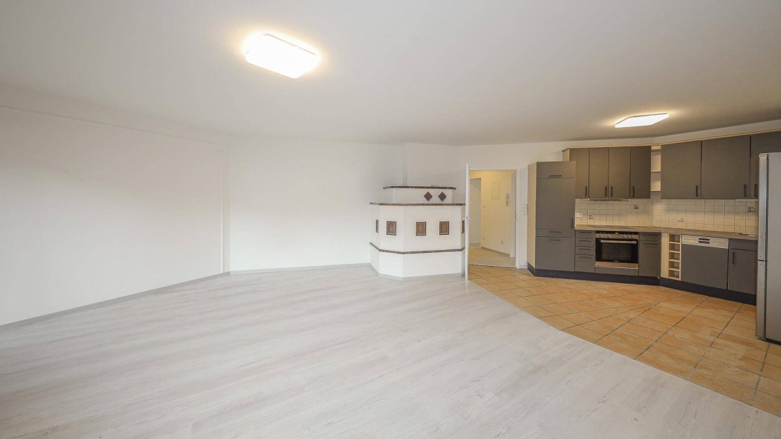 Die Wohnung teilt sich auf in den Eingangsbereich, 2 Schlafzimmer, ein Badezimmer mit Badewanne und den großzügigen Wohn-Essbereich mit eingebauter Küche und Kachelofen.