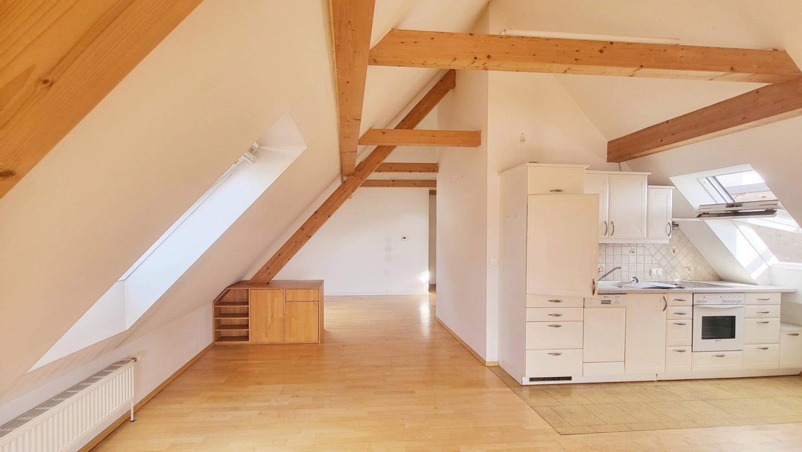 Der ausgebaute Dachstuhl bietet auf rund 82 m² Nutzfläche (davon 69 m² aufgrund der Dachschräge anrechenbar) ein großzügiges, offenes Raumgefühl. Zahlreiche Dachfenster fluten den Wohnraum mit natürlichem Licht, und die außergewöhnliche Raumhöhe von bis zu 4,5 Metern schafft ein luftiges, modernes Loftgefühl. Die offene Grundrissgestaltung ohne trennende Wände bietet maximale Gestaltungsfreiheit, ideal für kreative Singles oder Paare, die Wert auf individuelles Wohnen legen.