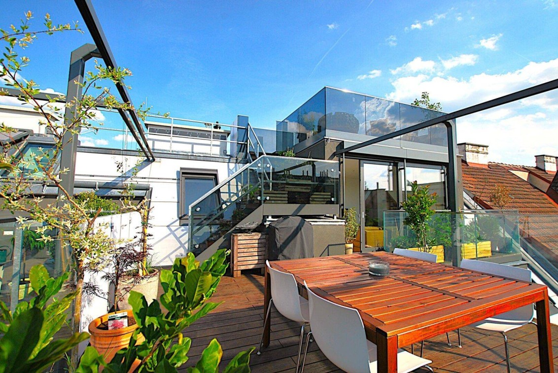 LUXUS DACHGESCHOSS - 4 Zimmer - 360° BLICK - ca. 204m² gew. NFL - ca. 50m² Terrassen - hochwertige Ausstattung - Einbauküche - 2 Garagenplätze - Rochusmarkt - Grüner Prater - 3+2 Jahre befristet