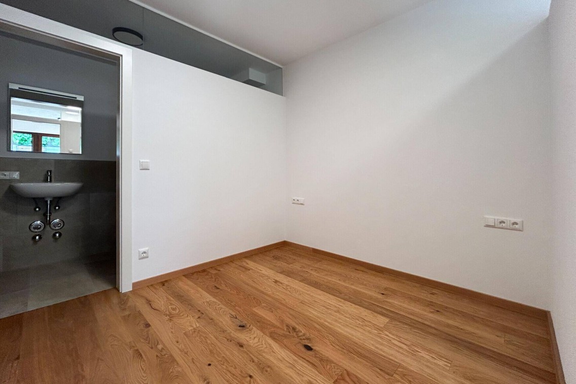 Die Wohnung verfügt über eine klare und effiziente Raumaufteilung mit einem Schlafzimmer, einem Wohnbereich und einem Bad mit bodentiefer Dusche. Zur Ausstattung gehören Fußbodenheizung, eine moderne Gas-Holz-Heizung, eine Einbauküche sowie ein Kleiderschrank. Die Wohnung ist teilmöbliert und sofort bezugsfertig.