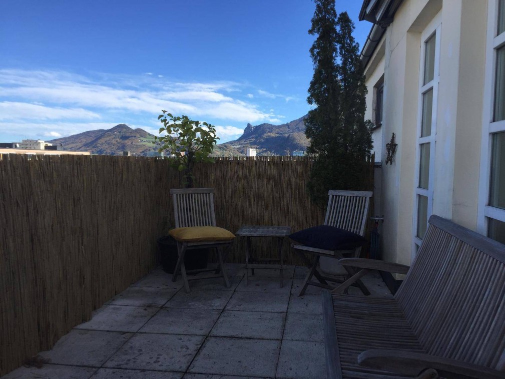 Ruhige ca. 83qm große, vollausgestattete 2,5-Zimmer-Wohnung mit 20 qm uneinsehbarer Dachterrasse (mit Blickrichtung auf Maria Plain) und ca. 5 qm sehr sonniger Südloggia mit Blick in die Berge für 1 Monat bis 2 Jahre zu vermieten. Gesamtnutzfläche inkl. Freiflächen ca. 102 qm. Die vorgelagerte Dachterrasse und die bodentiefen Fenster im Wohn- und Arbeitszimmer verleihen der Wohnung eleganten Penthouse Flair.