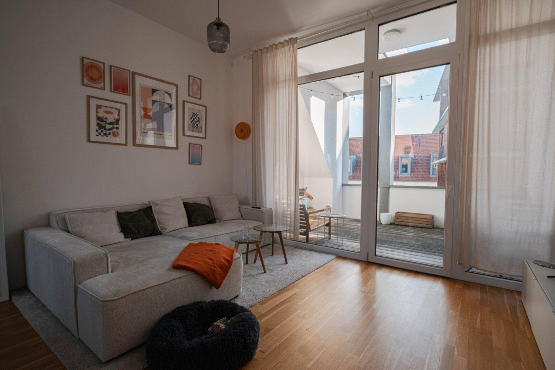 Diese stilvolle Dachgeschosswohnung vereint modernes Design mit großzügigem Wohnkomfort. Hohe Decken und große Fensterfronten schaffen ein lichtdurchflutetes, offenes Raumgefühl. Die hochwertige Design-Küche mit Markengeräten schließt direkt an den Wohn- und Essbereich an und bietet einen herrlichen Blick auf die rund 12 m² große Loggia. Das elegante Badezimmer mit Badewanne und Dusche lädt zum Entspannen ein und rundet das luxuriöse Ambiente ab.• Beeindruckend hohe Decken und großzügige Fensterfronten sorgen für viel Licht und ein offenes Raumgefühl