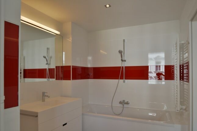 Im Badezimmer erwartet Sie ein Waschtisch, Badewanne, Fenster, Waschmaschinenanschluss und ein Sprossenheizkörper für warme Handtücher. Separates WC vom Vorraum begehbar.