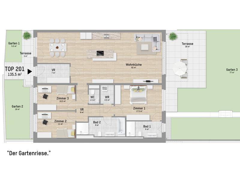 • Hochwertige Markenausstattung (Echtholzparkett, Feinsteinzeug-Fliesen, Holz-Alu-Fenster mit 3-fach Isolierverglasung, uvm.)