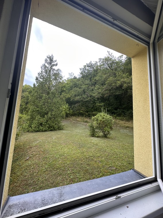 Das Wohnzimmer bietet eine gemütliche Atmosphäre mit Blick über den Anninger. Weiters gibt es eine Schlafniesche, in der ohne Probleme ein größeres Bett seinen Platz findet und den Raum gemütlich gestalten lässt. Auch hier haben wir 2 Fenster die wieder Richtung Wald gerichtet sind.