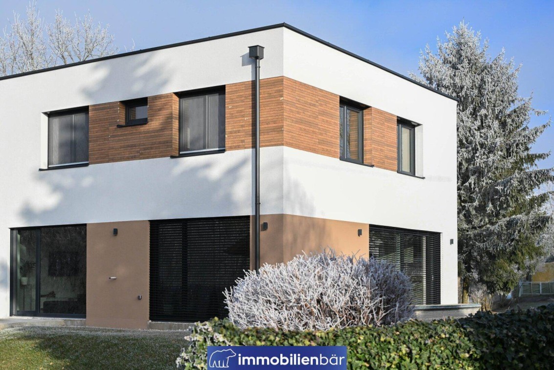 Im Handumdrehen kann man von hier seine Hauptmahlzeiten vom Essbereich direkt ins Freie verlegen, denn über eine Terrasse haben Sie Zugang zum Garten mit idyllischem Grünblick. Diese Wohnebene mit Gartenzugang bietet viel Platz für Familien oder auch Gäste, so wurde hier ein eigenes Gäste-WC eingeplant.Rückzugsort für die Familie - das Obergeschoß.Über einen lichtdurchfluteten Aufgang gelangt man ins Obergeschoss, welches den Rückzugsort für die ganze Familie bildet. Hier befindet sich ein großes Schlafzimmer mit eigenem Bad. Gegenüberliegend befinden sich 2 weitere Zimmer, die als Kinderzimmer vorgesehen sind. Besonders vorteilhaft ist ein weiteres Badezimmer, das getrennt vom Elternbadezimmer genutzt werden kann.Raum für Ideen - das Untergeschoss.Das gesamte Gebäude ist unterkellert und bietet hier noch mal mehr Platz und Stauraum. 2 Räume im Keller können zum Beispiel als Hobbyraum, Büro oder Jugendraum genutzt werden. Das Kellergeschoss würde sich zudem auch für eine hauseigene Wellnessoase gut eignen.Architektur und Raumplanung vom Feinsten.Das moderne Architektenhaus ist smart konzipiert und bietet auch Platz für 2 Fahrzeuge. Im Zufahrtsbereich wurde der Platz für ein zukünftiges Carport gleich eingeplant. Architektur und helle Raumplanung vom Feinsten treffen bei diesem tollen Objekt auf ausgewählte Materialien und exklusive Raumausstattung. Die Echtholzböden verleihen den Wohnräumen eine heimelige Atmosphäre, wohingegen die Gestaltung der Badezimmer einen Home-Spa-Effekt mit sich bringen. So können Sie sorglos in ihr neues Eigenheim