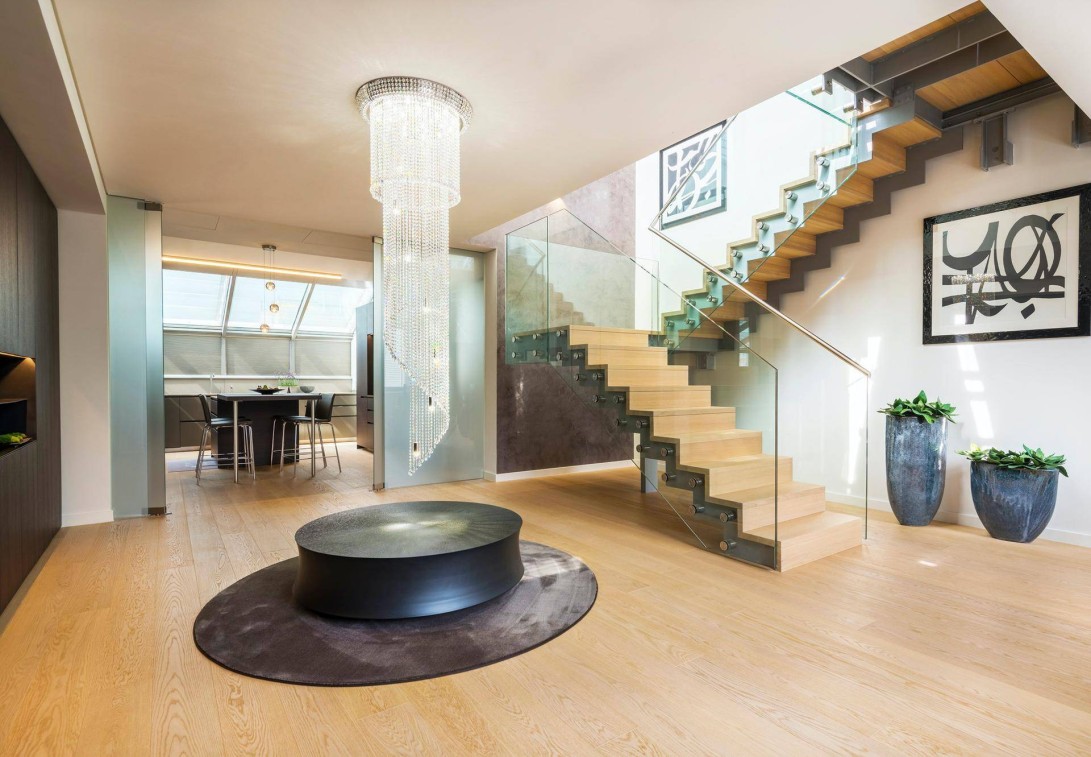 Im Hauptgeschoss befinden sich drei Schlafzimmer mit en-suite Badezimmer, Schrankräumen und eine Loggia Richtung Innenhof. Der exklusiv gestaltete Wohn-Essbereich verfügt über einen offenen Kamin und umfasst eine Größe von ca. 124 m². Hier befindet sich auch eine direkt angeschlossene Küche, welche jeden passionierten Koch mit ihrer Ausstattung begeistern wird.