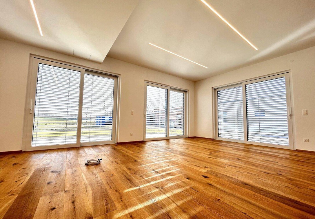 Erfahren Sie pures Wohnglück in Grünruhelage Nahe dem begehrten Neufelder See.Ein stilvoller Bungalow mit viel Liebe zum Detail, präsentiert sich auf einem Pachtgrund in exzellentem Zustand und verfügt über sämtliche Annehmlichkeiten für ein komfortables und erfüllendes Leben. Das geschickt durchdachtes Raumkonzept sorgt bei Bedarf für die Möglichkeit zur Schaffung eines zusätzlichen vierten Zimmers (siehe Grundriss). Hier können Sie unbeschwert sämtliche Vorzüge der einzigartigen Lage in direkter Seenähe genießen und unvergessliche Momente mit Ihren Lieben teilen – ein Zuhause, welches Ihr Herz erfüllen wird und Sie sich rundum wohl fühlen werden.Beschreibung Grundriss:Zu Beginn werden Sie von einem großzügigen Eingangsbereich mit Platz für eine Garderobe und Gäste Toilette mit Waschtisch empfangen. Bereits beim Betreten des Wohn-/ Essbereichs, welcher durch die Vielzahl an bodentiefen Glaselementen sonnendurchströmt ist, werden Sie von Charme der Immobilie begeistert sein. Der knapp 42m² große Wohnraum mit Anschluss für eine offene Küche mit Kochinsel bietet Entfaltungsfreiheit und direkten Zugang auf die sonnige Terrasse mit angrenzendem Garten. Des Weiteren verfügt das Neubauhaus über zwei getrennte Schlafzimmer und einen praktischen Abstellraum für zusätzlichen Stauraum. Zu guter Letzt befindet sich das moderne Badezimmer mit Doppelwaschtisch, Regendusche, WM - Anschluss und zusätzlicher Toilette.Highlights auf einen Blick: