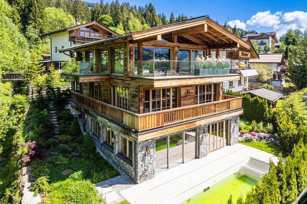 Ein komplett und hochwertig eingerichtetes Landhaus-Chalet in sehr guter Lage von Kirchberg in Tirol. Ein neu errichtetes Haus mit viel Luxus und hoher Bauqualität. Unter Verwendung von Alt(antik)holz im gesamten Innenausbau und in der Außengestaltung. Im Erdgeschoss sind zwei Schlafzimmer mit Bad und Balkon eingerichtet. Der Personenaufzug verbindet alle drei Etagen, wobei sich im Untergeschoss der großartige Wellnessbereich mit Zugang zum Freischwimmbad und zum Garten befindet. Hier sind zusätzlich zwei Schlafzimmer mit Bad angeordnet. Ein Kellerraum, ein Wäscheraum und die Haustechnik sind auch hier untergebracht. Das Wohnhighlight stellt sicherlich der Wohnzimmer- Essbereich im Dachgeschoss dar, der von einem Sichtdachstuhl überzogen ist. Ein offener Kamin ist vorhanden und große Fensterfronten bilden die Verbindung auf die große Balkonterrasse.
