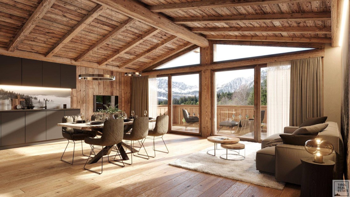 Das Apartment TOP 4, am rechten Rand des Erdgeschosses der SUITES Ellmau, bietet einen traumhaften Blick nach Osten auf die malerische Umgebung des Wilden Kaisers. Gäste starten mit sonnigen Morgenstunden gemütlich in den Tag.