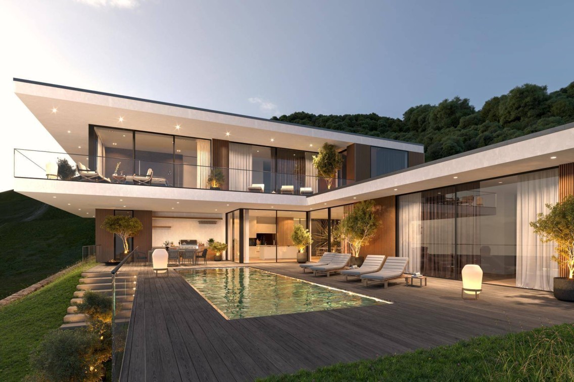 Im Außenbereich befindet sich auf der ca. 124 m² großen Terrasse ein Edelstahlpool mit den Maßen 9x3 Meter, der mit einer Solar-Abdeckung ausgestattet ist. Ein optionaler überdachter Bereich bietet Platz für eine großzügige Outdoor-Küche. Die Energieversorgung des Hauses erfolgt über eine Photovoltaikanlage mit einer Leistung von ca. 10 kWp und eine Wärmepumpe, die sowohl Heizung als auch Raumkühlung übernimmt. Für Elektrofahrzeuge steht eine 11 kW Lademöglichkeit in der direkt angrenzenden Garage bereit, die Platz für drei Fahrzeuge sowie Fahrräder auf einer Fläche von ca. 79 m² bietet.