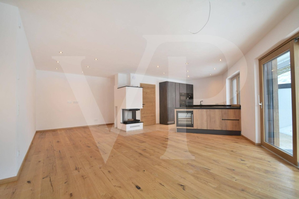 Im Erdgeschoss dieser modernen Wohnung befindet sich der offene Wohn-/ Ess-/ Küchenbereich mit offenem Kamin und Zugang zur Terrasse sowie zum Garten.