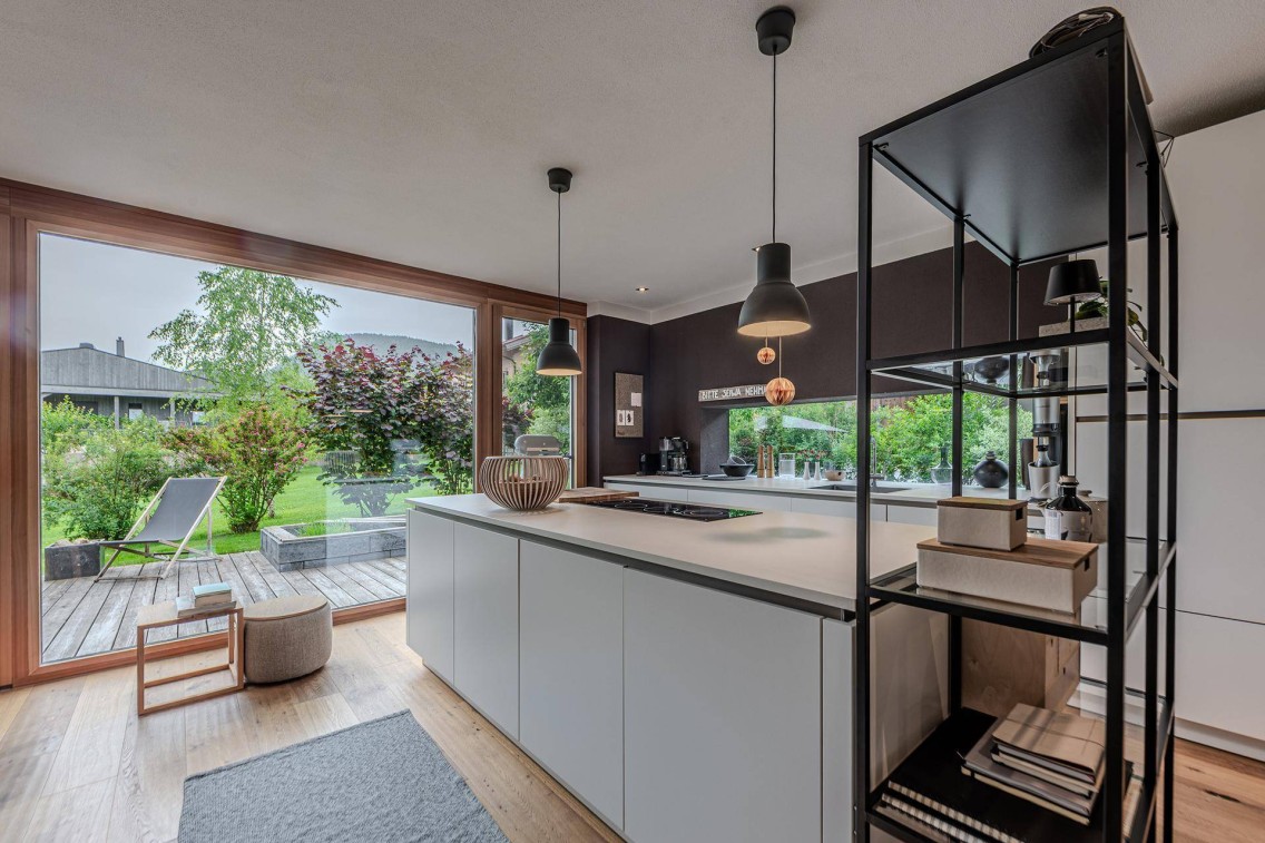 Architektonische Raffinesse entsteht im Außenbereich durch den Einsatz einer Lärchenverschalung, die sich in qualitätvoller Feinarbeit bis in die Fensterlaibungen und die Fensterrahmen im Innenraum zieht. Das schlanke Balkongeländer aus anthrazitfarbenem Metall und die steinerne Abdeckung des Untergeschoßes sorgen in Kombination mit dem Holz für einen puristischen Dreiklang zeitloser Materialien.