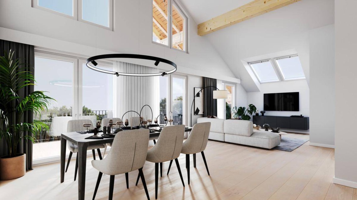 Die neun 1,5- bis 4-Zimmer-Wohnungen vereinen stilvolles Design mit nachhaltigem Holzbau. Große Fenster sorgen für viel Licht, während die natürliche Bauweise ein gesundes und angenehmes Raumklima schafft.