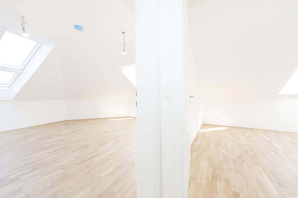 Abgesehen von der idealen Raumaufteilung überzeugt die Wohnung nicht nur mit großen Fensterflächen, außenliegenden Rollläden, dreifach verglaste Holz-Alu-Fenster, Fußbodenheizung, sondern auch mit Raumhöhen bis zu 2,8 Meter.