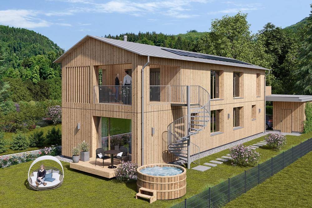 „Haus Schafberg“ vereint modernen Wohnkomfort mit der friedlichen Ruhe der Natur. Die offene Raumgestaltung lässt das Tageslicht in alle Bereiche fließen, während die Massivholzbauweise für eine wohlige Wärme und Geborgenheit sorgt.