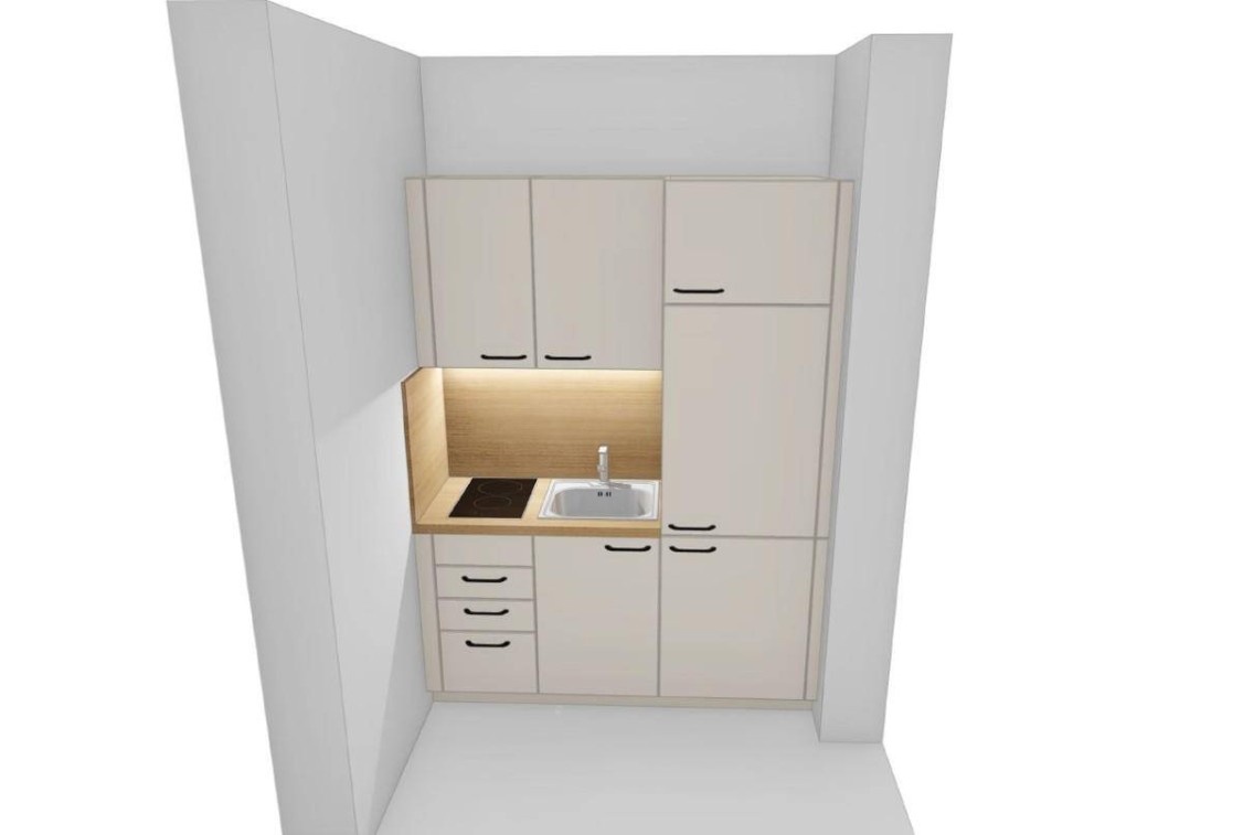Die Wohnung selbst gliedert sich in einen Vorraum, ein Badezimmer mit Dusche und WC, einen Wohn-Schlaf-Raum mit Kochnische sowie eine Loggia. Der Wohnraum bietet genügend Platz für eine ausziehbare Couch/Bett, Kommoden, Schränke oder einen kleinen Esstisch. Zusätzlich gehört zur Wohnung ein Kellerabteil mit 10 m² sowie ein PKW-Stellplatz im Freien.