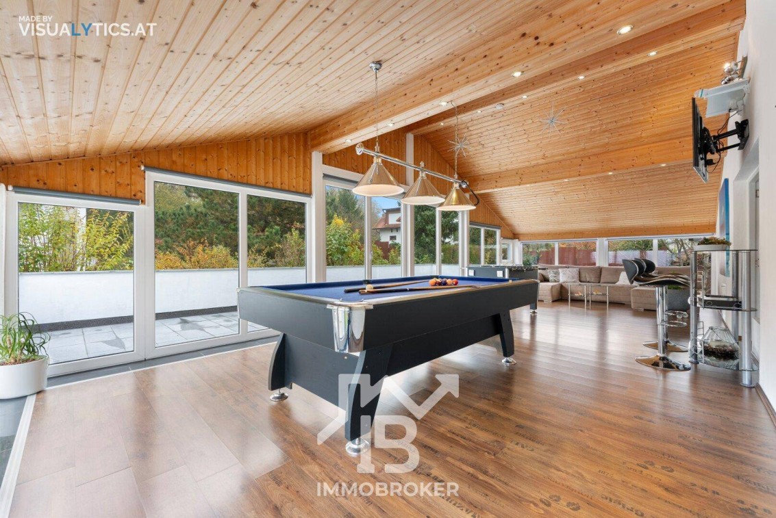 Luxuriöses Einfamilienhaus in idyllischer Lage - Perfekt für Familien Dieses traumhafte Einfamilienhaus bietet Ihnen alles, was Sie sich für ein komfortables und stilvolles Leben wünschen. Mit einer Wohnfläche von ca. 212 m², bietet diese Immobilie ausreichend Platz für Sie und Ihre Familie.Die großzügige Wohnfläche verteilt sich auf helle und offen gestaltete Räume, die durch große 3-fach-verglaste Fenster mit natürlichem Licht durchflutet werden.Der über 40 m² große Wintergarten ist nicht nur lichtdurchflutet, sondern auch ein echtes Highlight für Freizeit und Entspannung. Ausgestattet mit einem stilvollen Billardtisch und einem Tischfußball-Tisch bietet er Spaß und Unterhaltung für die ganze Familie oder gesellige Stunden mit Freunden. In der gemütlichen Sitzecke können Sie zudem entspannte Abende verbringen – ob bei einem spannenden Sportevent auf dem Fernseher oder einfach bei einem Gläschen Wein. Dieser Raum verbindet Erholung und Aktivität auf einzigartige Weise und wird garantiert zum Lieblingsplatz im Haus.Die hochwertige Einbauküche bietet Ihnen genügend Stauraum und ist mit allen nötigen Geräten ausgestattet. Hier können Sie entspannt Ihre Mahlzeiten zubereiten und gleichzeitig den Ausblick auf den grünen Garten genießen.Die beiden Badezimmer, wovon das Hauptbadezimmer mit Dusche und Whirlpoolwanne ausgestattet ist, lassen keine Wünsche offen.Eine Fußbodenheizung sorgt für angenehme Wärme im gesamten Haus, während die Alarmanlage Sicherheit und ein beruhigendes Gefühl bietet.Das Haus kann sowohl über die Wärmepumpe, als auch mit dem Kamin beheizt werden.Die beiden Balkone sind sehr großzügig gestaltet.Der Garten bietet ausreichend Platz für Ihre individuellen Gestaltungsideen. Auf den zwei Balkonen und der Terrasse können Sie die Sonnenstrahlen und den Ausblick auf die umliegende Landschaft genießen.Zusätzlich wurden alle Fenster in den Wohn- und Schlafräumen mit elektrischen Rollläden und Fliegengitter ausgestattet.Weiters verfügt das Haus über eine große Doppelgarage und einen großen Vorplatz, welcher genügend Parkmöglichkeit für Ihre Gäste bietet.Der Vermittler ist als Doppelmakler tätig.