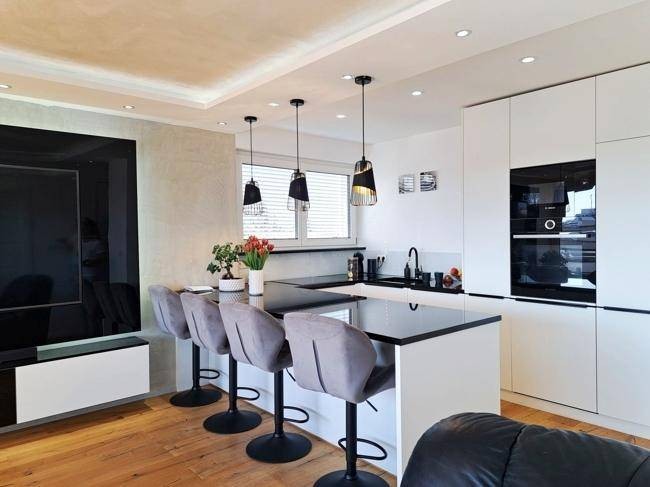 Die Wohnung besteht aus einer großen moderner Küche mit hellem Wohnbereich, 2 möblierte Kinderzimmer , 1 Schlafzimmer mit hochwertigem Einbauschrank und Bett, neu saniertes Badezimmer, Einbauschränke für Stauraum. Der sonnige Balkon bietet einen wunderbaren Weitblick. Viele Fenster und die Balkontüre sind mit einer 3 Fachverglasung ausgestattet. Die Wohnanlage besteht aus nur 8 Wohneinheiten. Alle Türen wie auch Fußböden wurden neu eingebaut.