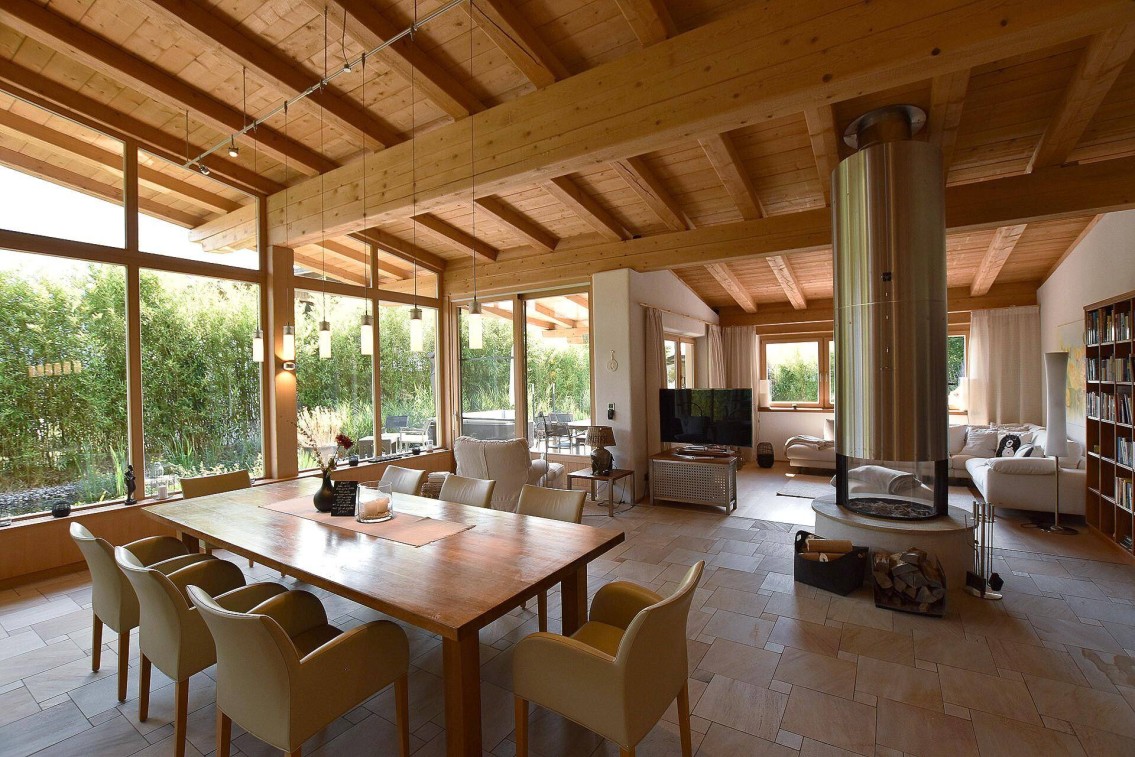 Der offene Dachstuhl sorgt im Wohn- und Essbereich für eine einladende, luftige Atmosphäre, während ein stilvoller Kamin Wärme und Behaglichkeit ausstrahlt. Die hochwertige, offen gestaltete Küche beeindruckt mit ihrer Ausstattung, die professionellen Ansprüchen gerecht wird.
