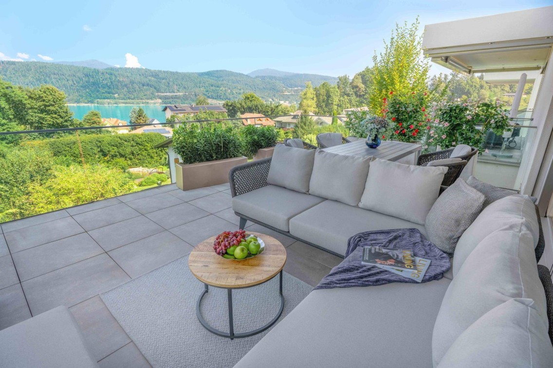 Dieses traumhafte Apartment befindet sich ruhig gelegen in einer schönen, sehr gepflegten Wohnanlage in Auen am Wörthersee, nur wenige Fahrminuten vom Zentrum Velden entfernt. Die Wohn-Nutzfläche umfasst ca. 94 m² und zeichnet sich durch eine offene, großzügige Raumaufteilung aus. Elegantes Mobiliar, exklusive Materialien und erstklassige Technik bieten Wohnkomfort auf höchstem Niveau. Der offene Wohn-Essbereich erstrahlt in hellem Licht und harmoniert perfekt mit der großzügigen, einladenden Terrasse, die eine traumhafte Wohlfühloase mit atemberaubendem Ausblick bietet.