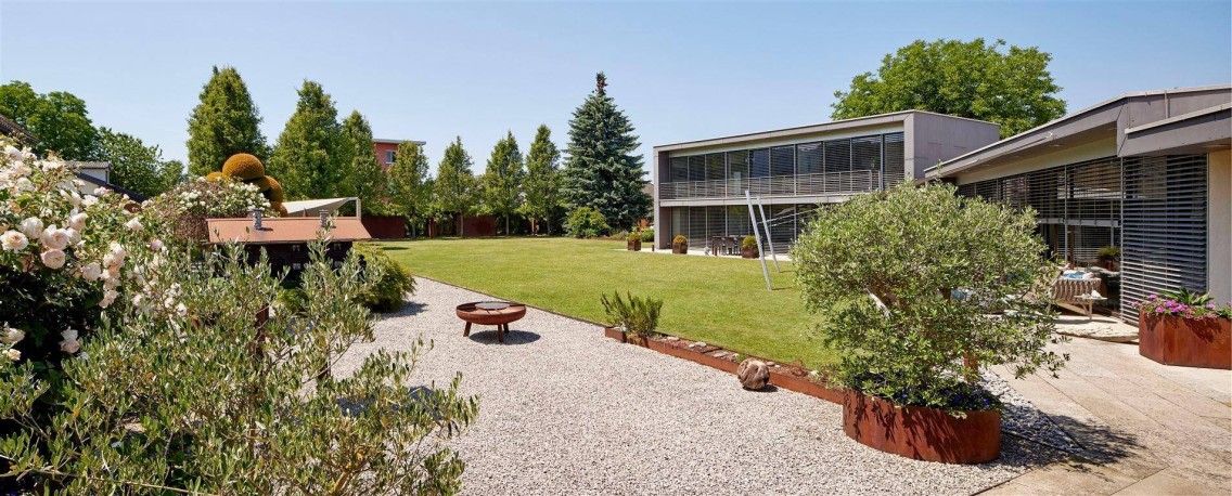 Durch die besondere Architektur und die Größe des Grundstückes ist ein nahezu intimer Bereich in der sehr gepflegten Gartenanlage entstanden.