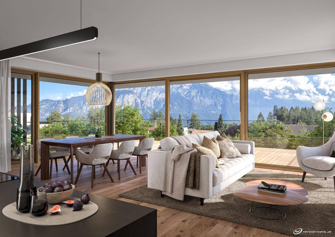 Großzügige Terrassen mit einzigartigem Blick auf die Nord-kette ermöglichen ein Wohnen mit täglichem Erholungsfak-tor. Neben einer gewohnt hochwertigen Gebäudehülle mit 3-fach Wärmeschutzverglasung wird das Gebäude mit ei-ner Luft Wärmepumpe für Heizung und Warmwasser ausge-stattet. Eine ca. 230 m² große Photovoltaikanlage auf dem Dach und der Fassade deckt im Jahr in etwa den Energie-verbrauch für Heizung und Warmwasser ab. Um diese ef-fiziente Nutzung zu erzielen, ist das Konzept so ausgelegt, dass alle Abnehmer im Haus, wie Wohnungsstrom,