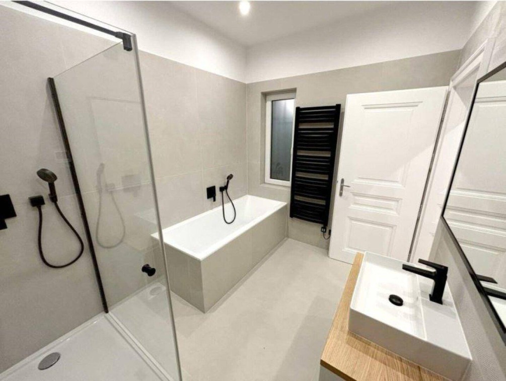 Badezimmer mit Waschtisch, Badewanne, Dusche und Markensanitär