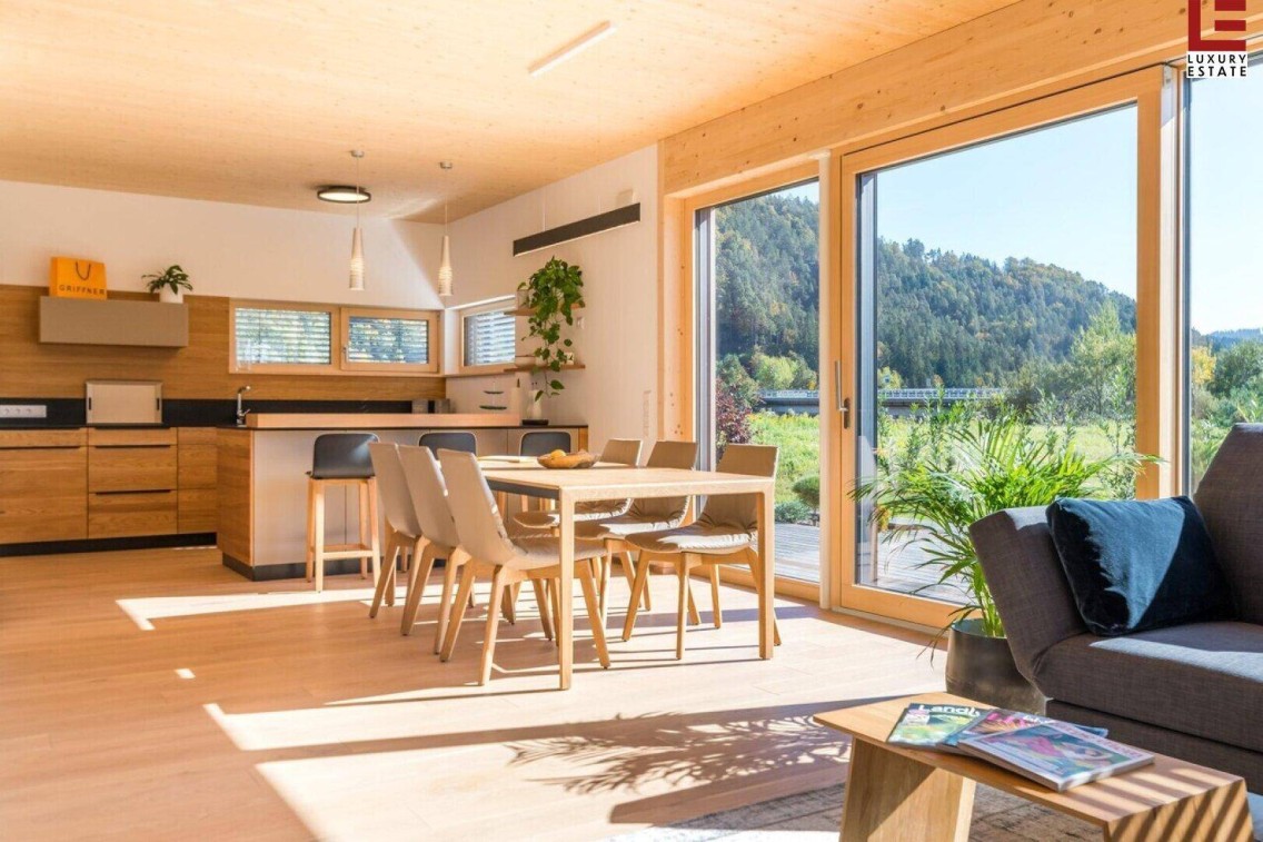 Sie haben jetzt die einmalige Gelegenheit, ein gut geplantes massives Holz-Rahmenbau-Reihenhaus mit rund 90 m² perfekt aufgeteilter Wohnfläche, einem schönen Wintergarten (ca. 16 m²) und einem Balkon (ca. 32 m²) und perfekten Energie-Spar-Werten zu einem ausgezeichneten Preis-Leistungsverhältnis zu kaufen! Die Bauweise & Ausstattung kann sich sehen lassen: Außenwände mit 40 cm Gesamtstärke aus alpenländischer Hochgebirgsfichte, Lärchenholz-Fassade mit einer optimalen Erdwärme-Pumpe zur Heizung/Kühlung, solarthermische Wasseraufbereitung, Fotovoltaikanlage zur primären Eigenstromerzeugung, 3-fach verglaste Fenster & die massive Holz-Eingangstür, 15 mm Parkettböden mit Nieder-Temperatur-Fußbodenheizung. Die Innenwände können optional aus behaglichen Holz - oder elegant & weiß, mit optionalen Außenraffstores, bodenebene Duschen, Bad/WC-Ausstattungen + Sauna in Marken-Qualität ausgestattet werden! Neben dem Carport kommen Sie über die massive Holz-Eingangstüre in einen kleinen Vorzimmerbereich, der Sie in eine großzügigen Küche-Ess-Wohnzimmer führt. Von dem sehen Sie auf den schönen weitläufigen Wintergarten ins Grüne Richtung Süd-West. Eine bequeme Treppe führt Sie in das Obergeschoss, wo Sie 3 gemütliche Schlafzimmer, beide mit der vorgelagerten, gemütlichen OG-Holzterrasse. Von dort haben Sie einen herrlichen, weiten Blick in das Land. Neben dem Aufgang haben Sie eine praktische Abstellkammer und das große Badezimmer mit Dusche/WC mit einer integrierten optionalen Holz-Sauna. Ein geräumiger Carport und ein Auto-Abstellplatz sind bereits inkludiert! Bei Errichtung eines Hauptwohnsitzes können Sie noch mit einer Reihe von Zusatz-Förderungen rechnen. Bitte Sonder-Infoblatt anfordern! Alles in allem eine unkomplizierte, energie-effiziente Wohneinheit 4 + 2, in der Sie zu allen Jahreszeiten nicht nur sehr günstig wohnen, sondern auch viel (in der nahen Natur) erleben können. Alternativ können Sie dieses Objekt auch als solide Investition in die Zukunft mit Wertsteigerungspotenzial in Südkärnten und als gut zur mittelfristigen (Ferienwohnungs-) Vermietung geeignet ansehen.