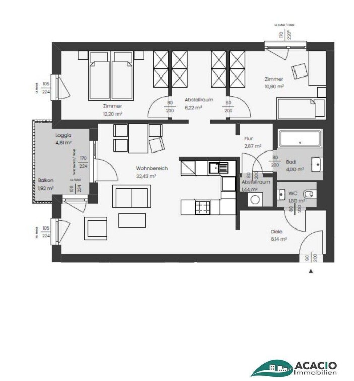 Über den Vorraum gelangt man direkt in den offen gestalteten Koch-, Wohn- und Essbereich, welcher das Herzstück der Wohnung ist. Von hier aus sind alle weiteren Räume begehbar. Die beiden Schlafräume sind über den gemeinsamen Schrankraum zu erreichen und über einen weiteren kleinen Vorraum kommen Sie in das Badezimmer mit Badewanne und Waschtisch.